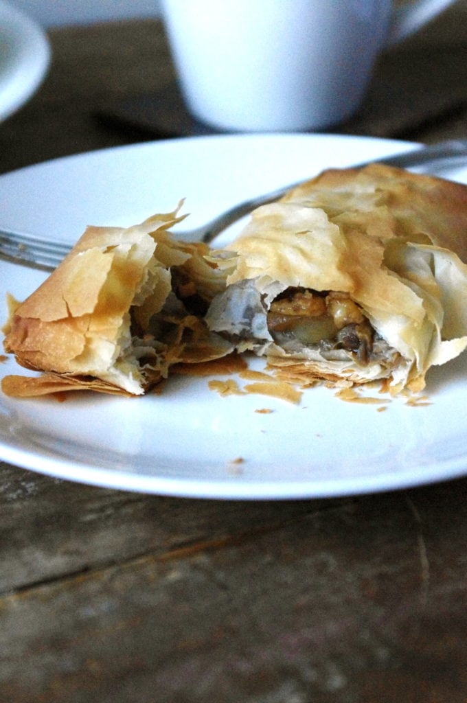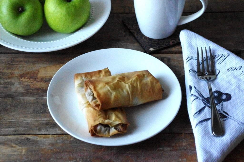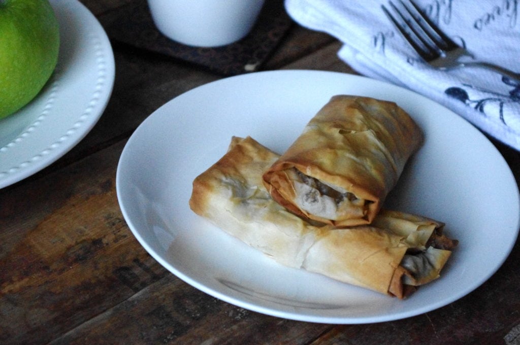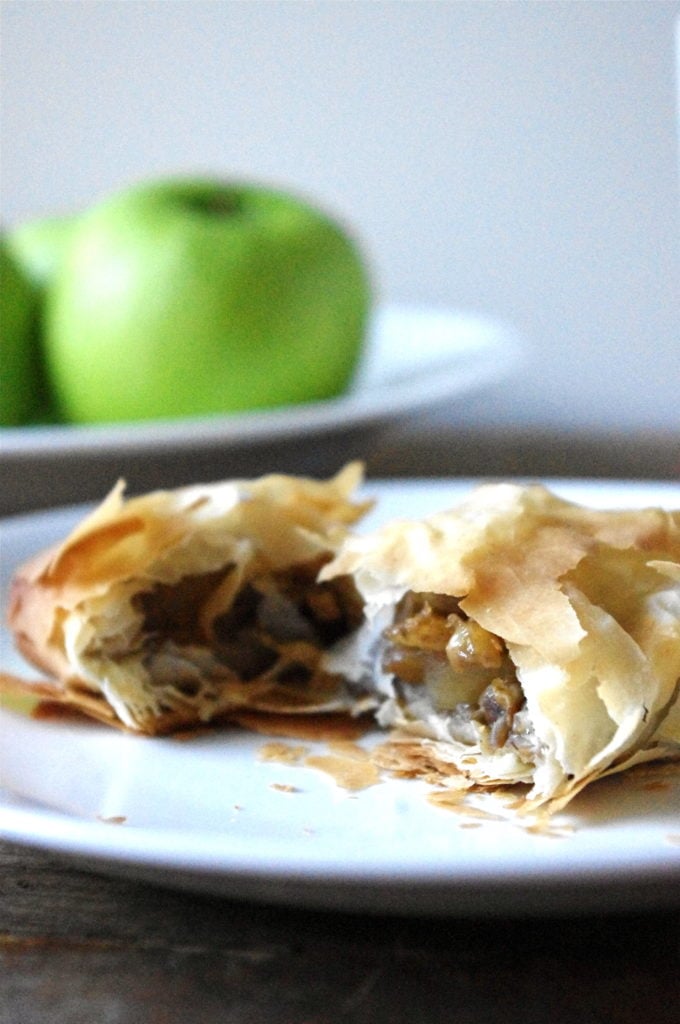 I also refrained from using butter, and used cooking spray for the phyllo pastry just to moisten it a little. The apple mixture is bound with some whole wheat pastry flour – just a tad, and the strudels come together using only one sheet of phyllo pastry each.