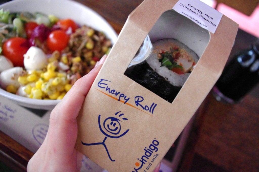 I made a salad with tomatoes, mozzarella, a tuna mizture, corn, and sunflower seeds, and had an “Energy Roll” on the side. The roll was a sushi roll with chicken breast, paprika and arugula. Sounds odd, but tasted amazing!