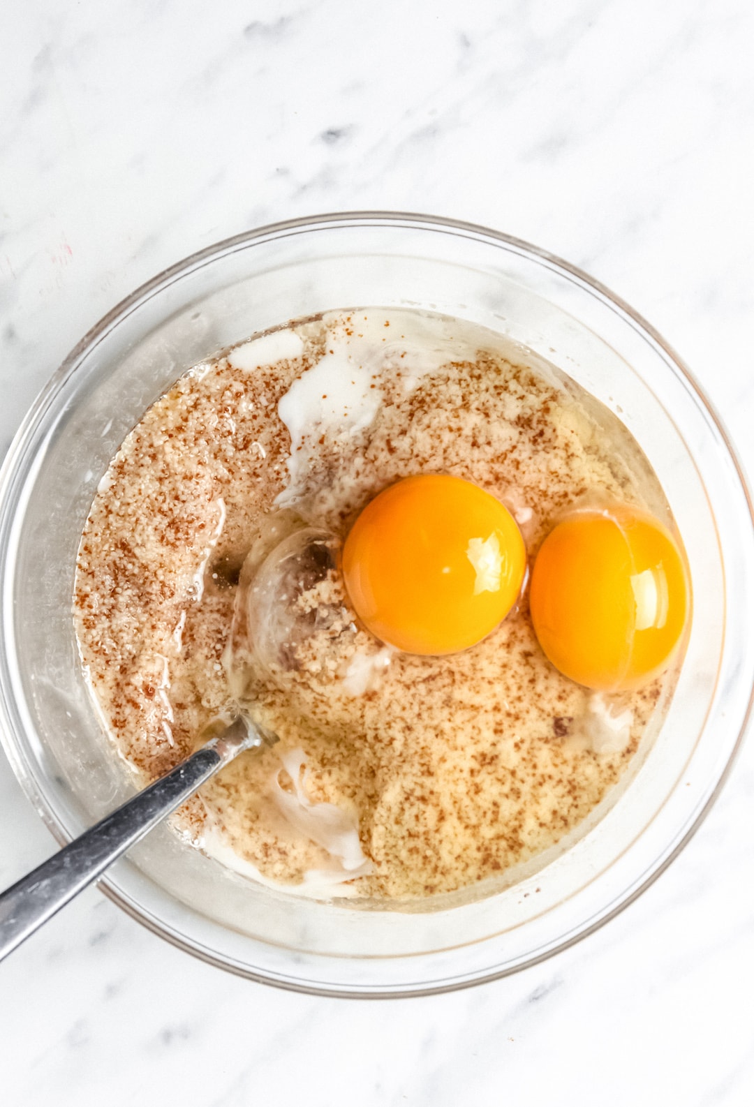 - Mix in the oil, almond milk, eggs, and vanilla extract and stir until smooth.