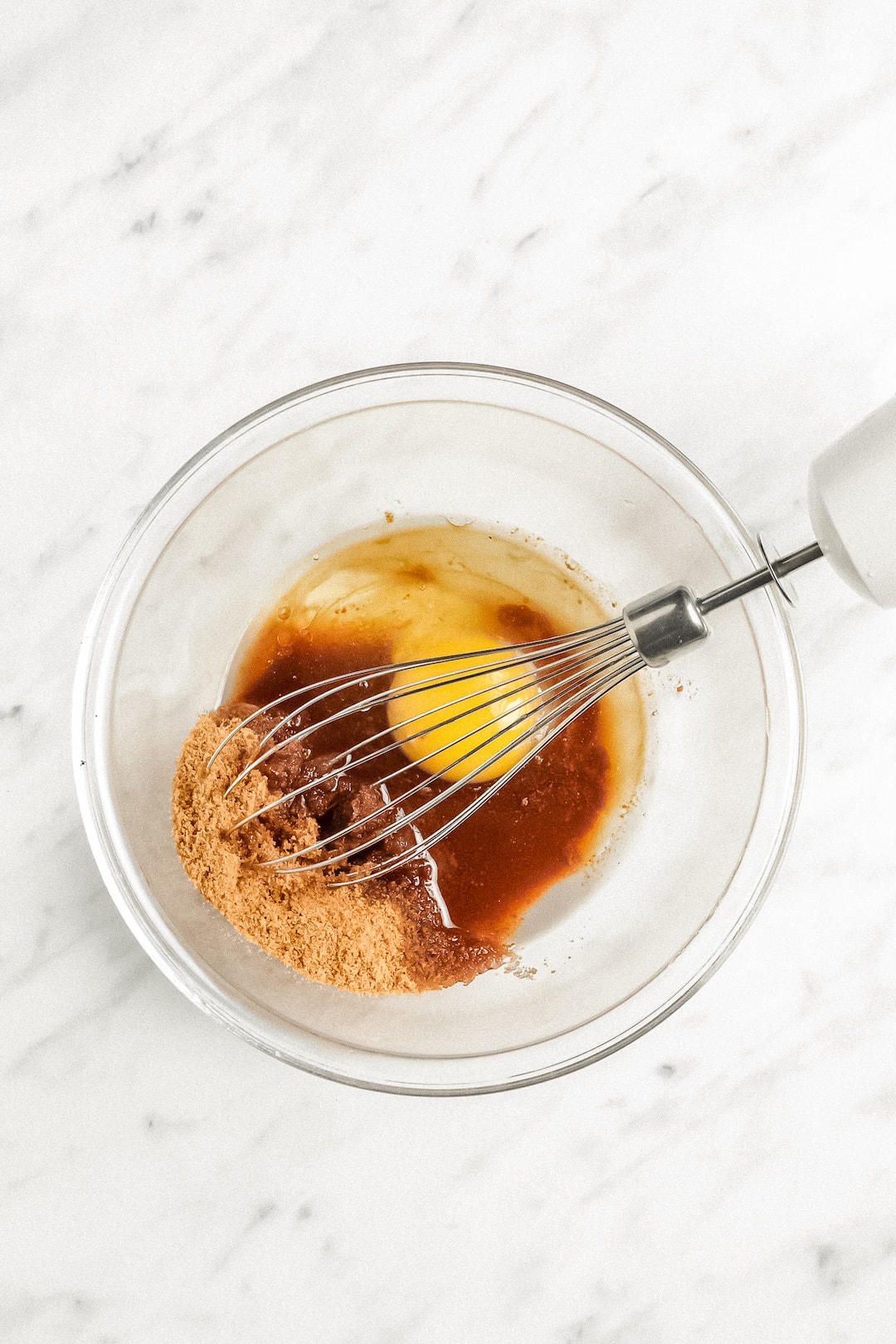 - Add in the coconut sugar, egg, and vanilla and beat with electric hand mixer on medium-high.