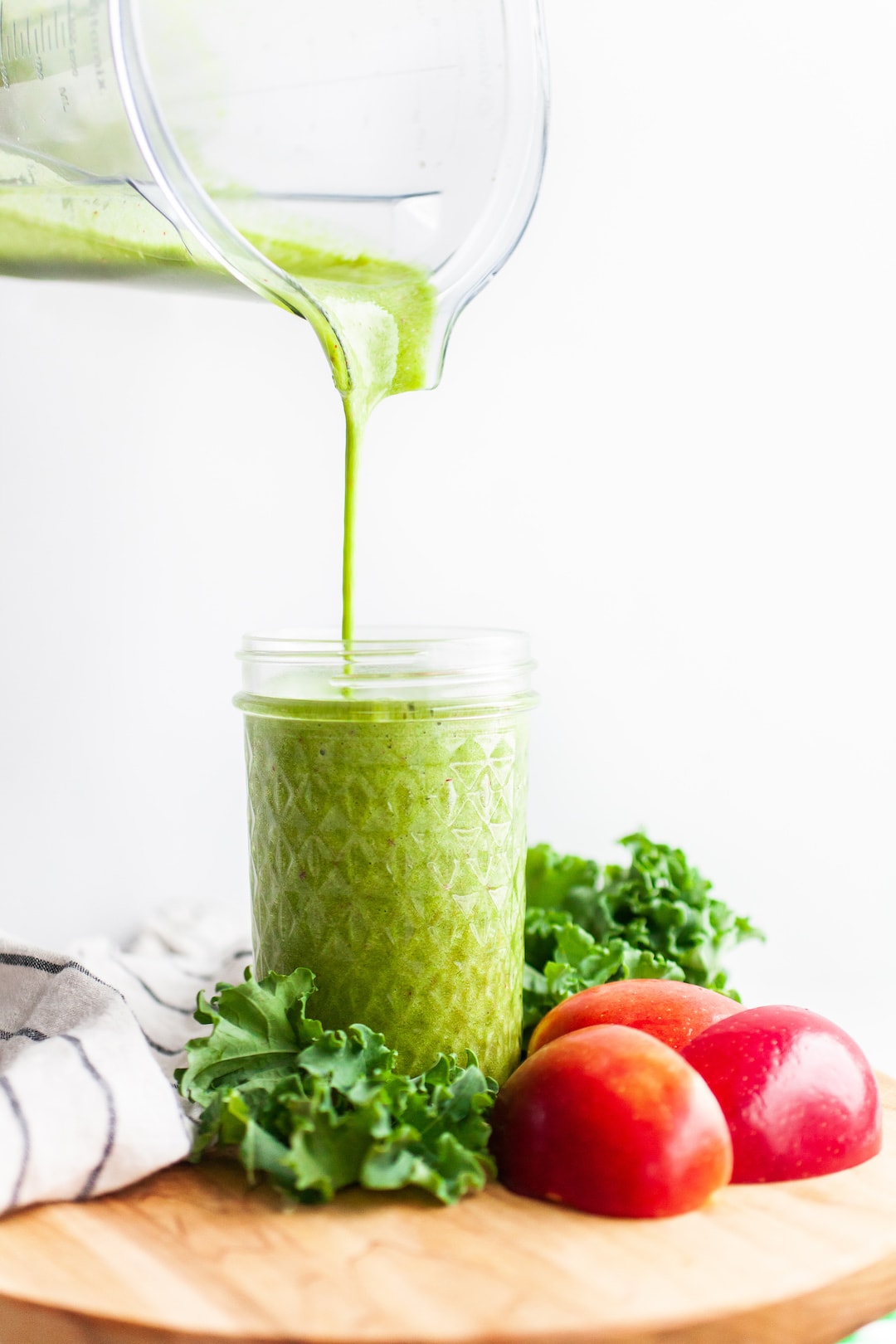 This sweet and fruity apple greens smoothie is packed with a mix of whole food ingredients containing carbohydrates and proteins, with loads of micronutrients (vitamins and minerals). The kale and apple are the star ingredients and apple is the dominating flavour (you can barely taste any kale at all!).