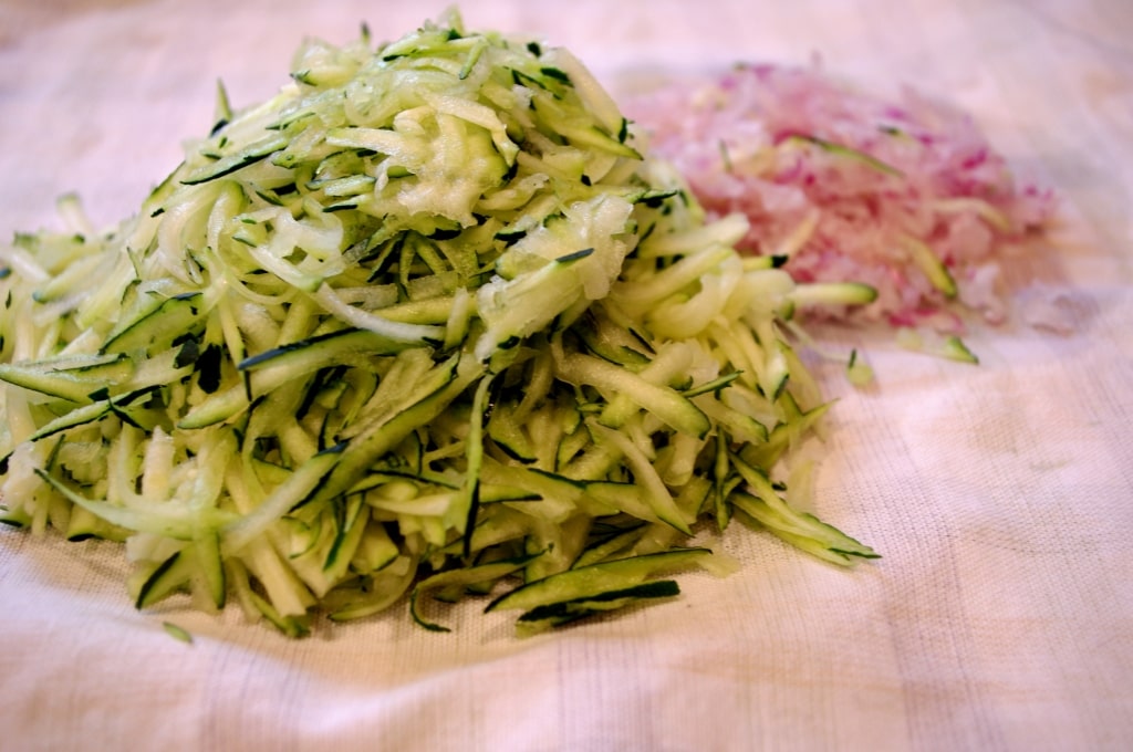 - With a grater, grate zucchini and red onion. Place grated vegetables in a kitchen towel and squeeze out the excess liquid (there will be a lot!).