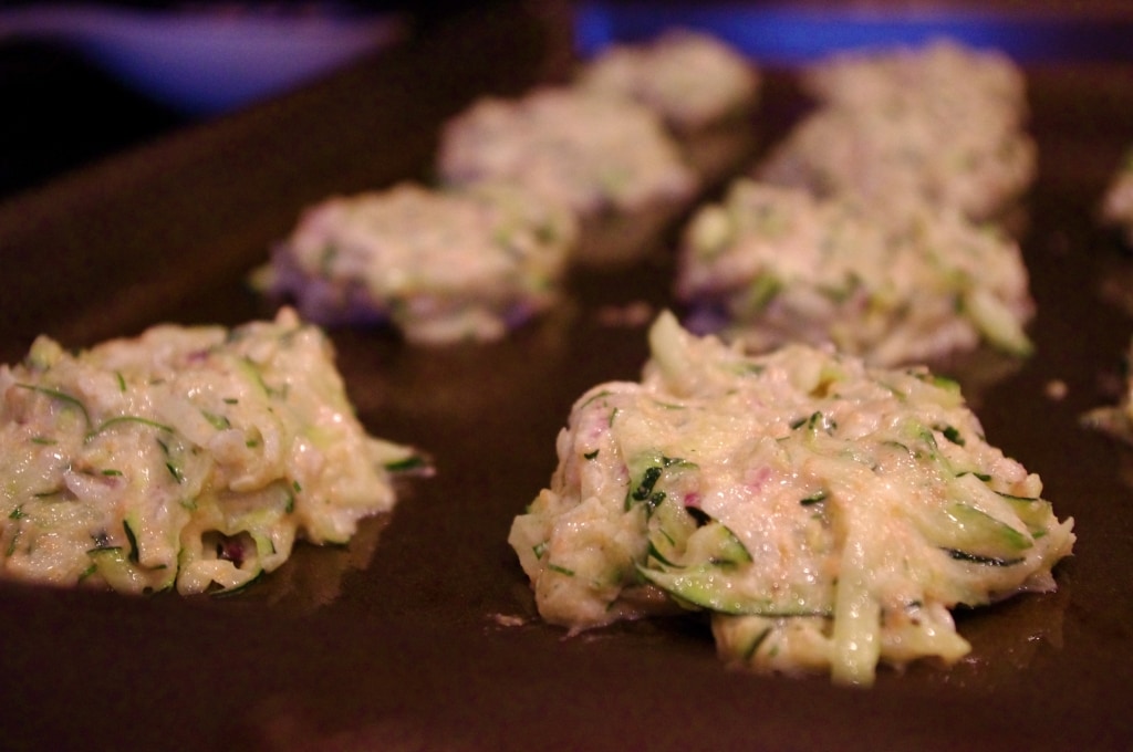 The use of spelt flour, the fact that they are baked, and zucchini as the main ingredient makes these a guilt-free nutritious snack (as long as you don’t eat all of them in one sitting! trust me, it’s hard!) Really though, at about 100 calories per 3 medium sized fritters and less than 2g of fat (in all three!), those are pretty good stats to me!