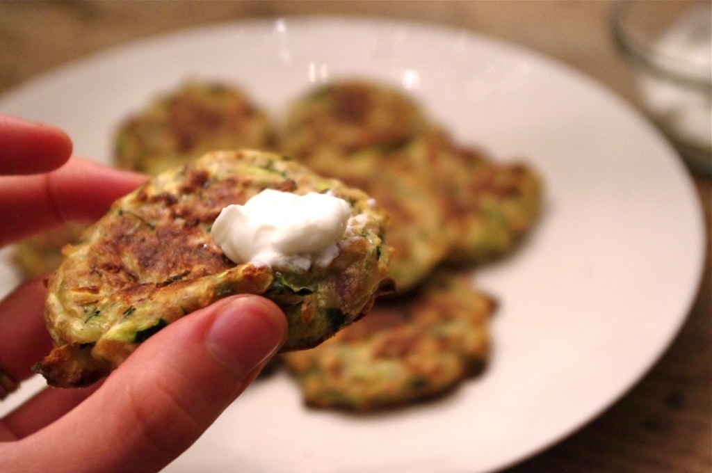 Recently I discovered the wonderful vegetable zucchini… not as in I had never heard of it before or anything, I just honestly never used it in my cooking! So when I made the ever so popular Baked Zucchini Chips, I figured I should start looking into more ways to make this lovely little vegetable the star in a yummy dish! I came across this recipe for zucchini fritters on a great blog, The Wishful Chef, and decided to give them a whirl, with my own little twists of course!