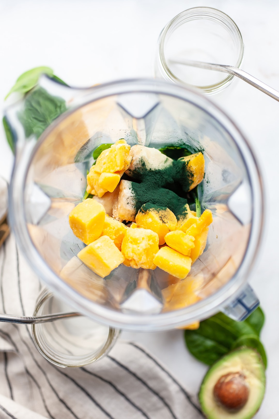 To be totally honest, spirulina powder does have an interesting…kind of funky flavour and smell, so you might be turned off when you open the container and get a whiff, it’s been said to taste kind of like lake water which isn’t a surprise considering it is sourced from the sea. But don’t fret, here’s the good part – when you add it to a smoothie with an abundance of naturally sweet fruits, it masks the flavour completely, giving the spirulina smoothie just a slightly earthy flavour that’s barely noticeable among the sweet, delicious fruits.