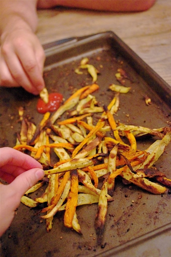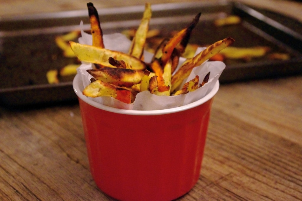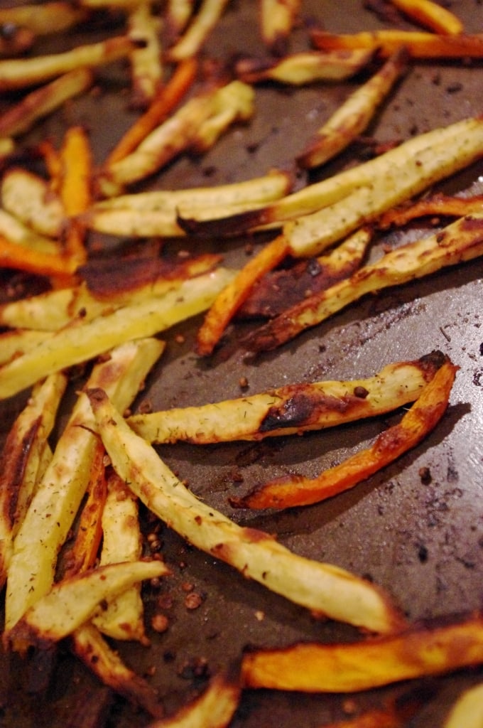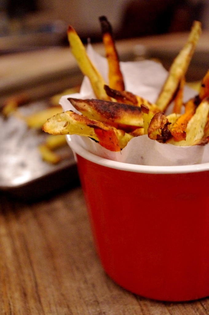I made these one night when the hubby and I were just hanging out at home and wanted a little snack to munch on. I had sweet potatoes in the cupboard and instantly thought of sweet potato fries. Then perusing through the fridge I noticed the carrots… they are a root vegetable, and potentially could taste good as fries too, so I thought what the heck, why not!?