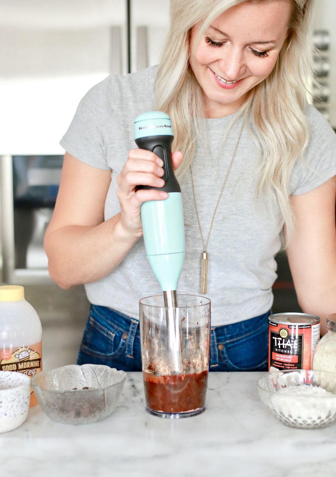 To make this healthy and easy dark chocolate fudge recipe I added all of the fudge ingredients into the KitchenAid Hand Blender jar and used the blender to create a creamy mixture that I could pour into the pan to top the almond flour cooke crust layer.