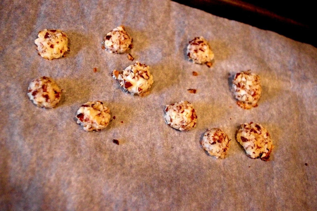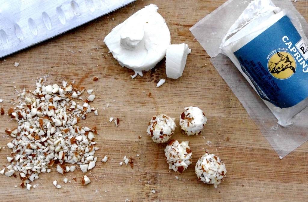 - Preheat oven to 400° and preheat BBQ to medium heat. Place chopped almonds on a small plate. Separate goat cheese into 6-8 round balls. Gently roll each goat cheese round in almonds, pressing gently so they adhere.