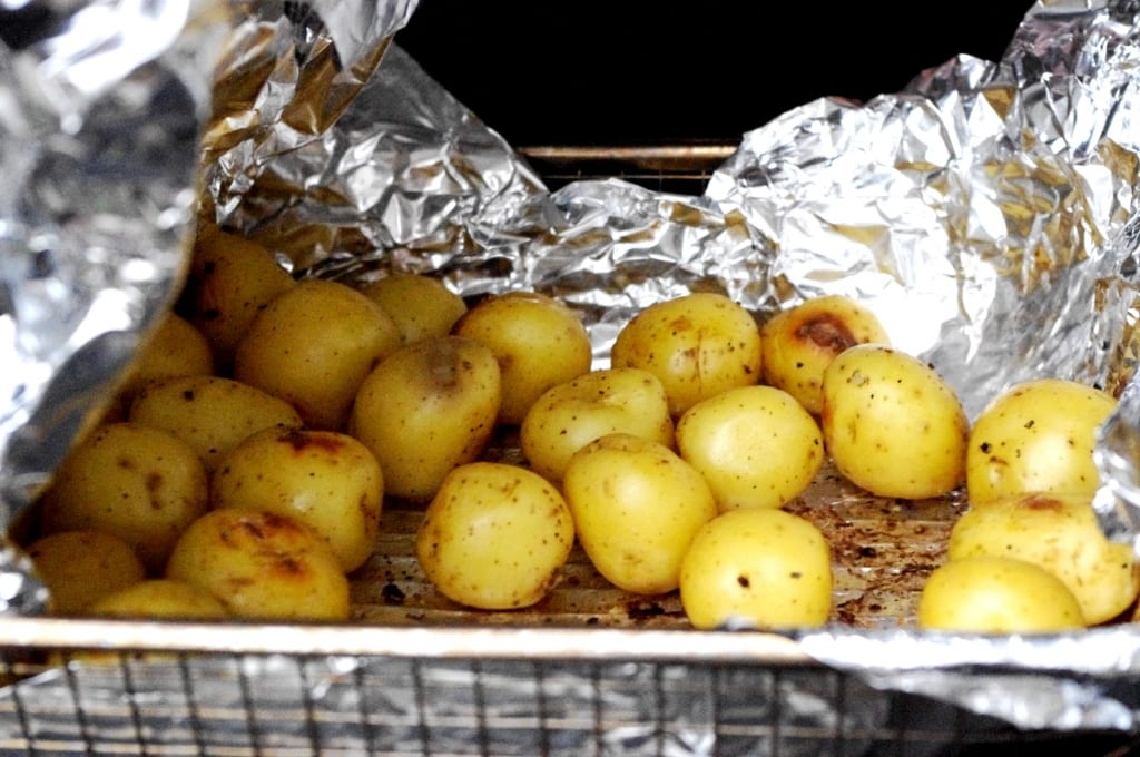 Now that the salad is done, the rest of the components are easy-peasy! For the potatoes, I just used baby potatoes, washed them and tossed them in a grilling basket lined with tinfoil. I used about 1 teaspoon of olive oil just to lightly coat them and then sprinkled on some salt and pepper. Very simple yet very delicious!