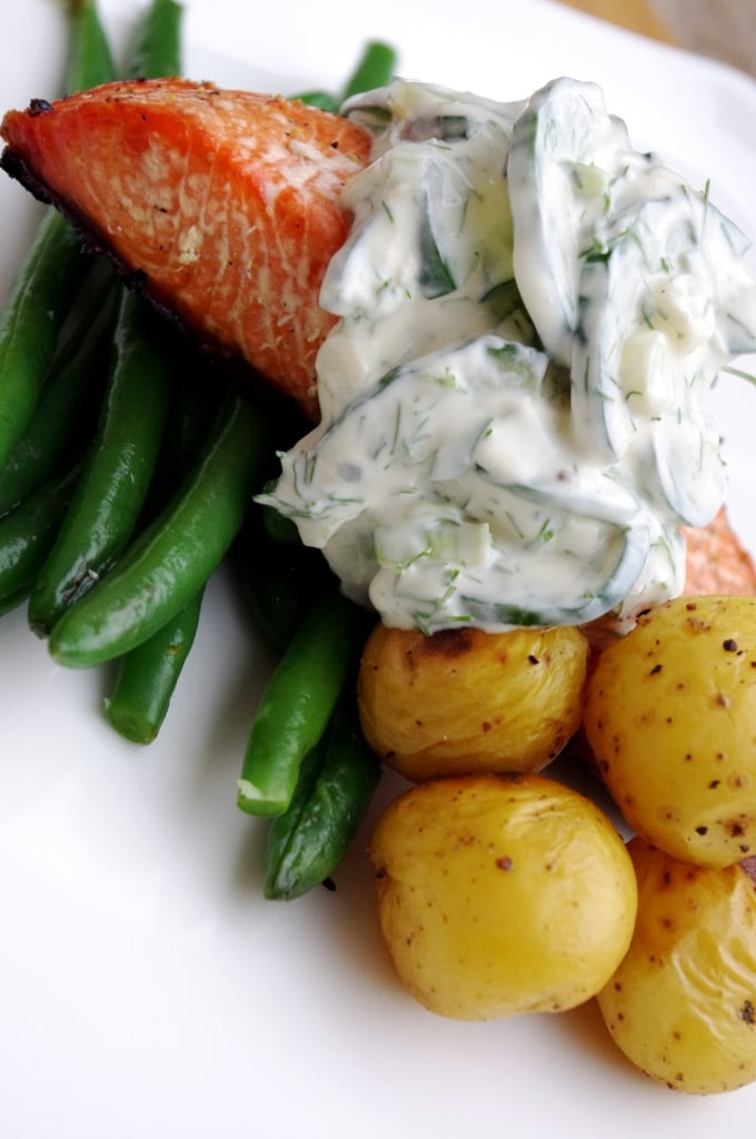 Dill is really the star in this recipe. It is not overpowering, but compliments the salmon, potatoes and veggies, wonderfully. The cucumber in the salad adds crunch and texture, and makes the salad light and airy. I adapted this recipe from many I had seen online and lightened it up by using light sour cream and fat-free Greek Yogurt rather than mayonnaise and full fat sour cream. It really cuts down on the fat and calories without losing that creamy taste and texture. Instead of using table sugar, I used my trusty coconut sugar, and cut down on the amount, as I found it really doesn’t need much at all.