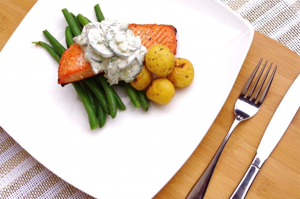 Wonderful for a hot sticky night. We had fresh farmers market aparagus with it instead of green beans and roasted them on the grill too. No need for indoor coooking. Dill sauce is very refreshing. Will be a regular on our menu.