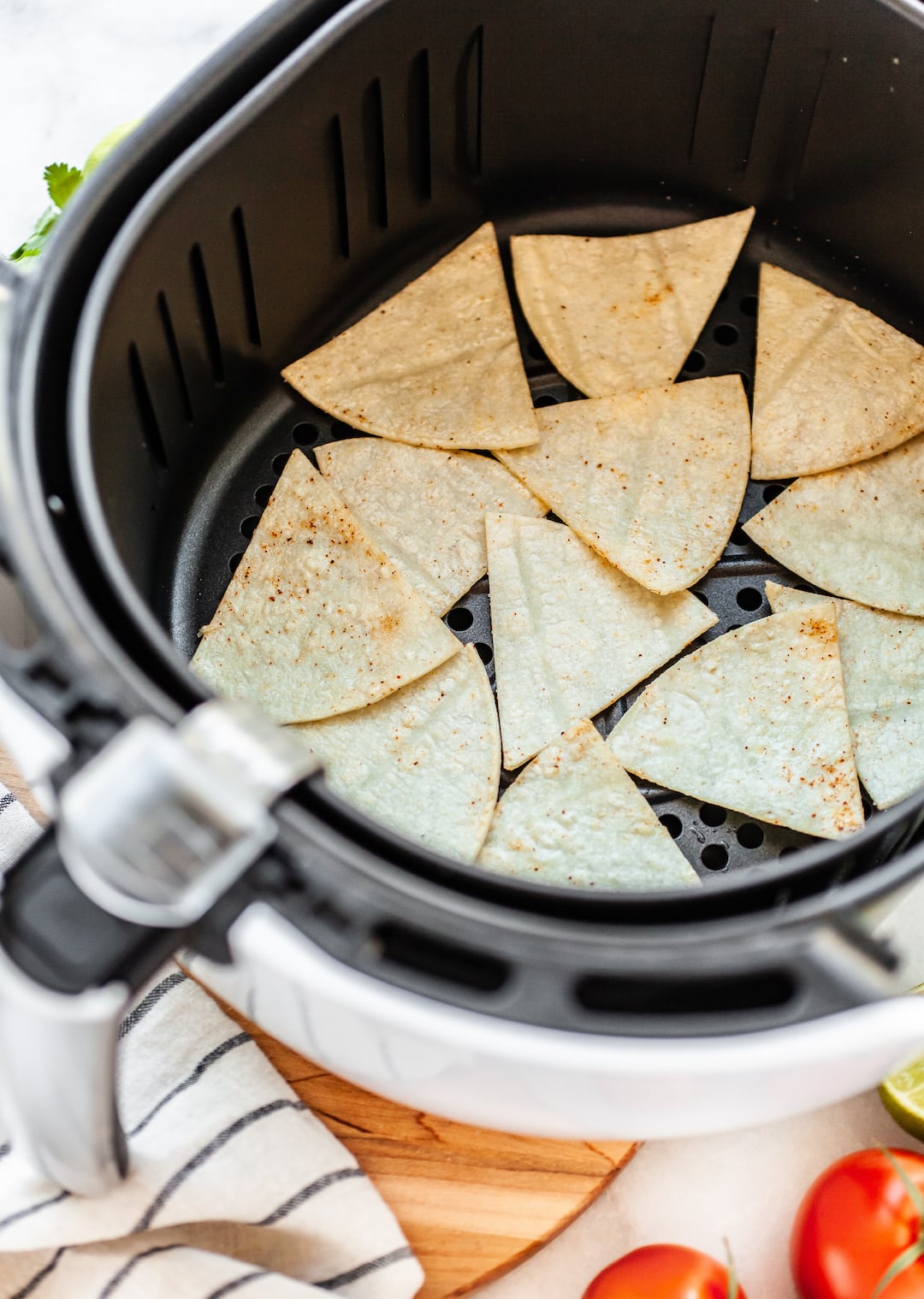 - Margarita Lime: Bring in the lime with this margarita twist! When the tortilla chips are done cooking in the air fryer toss them in a bowl with 1 tablespoon of lime zest and an extra pinch of chili powder, then let cool.