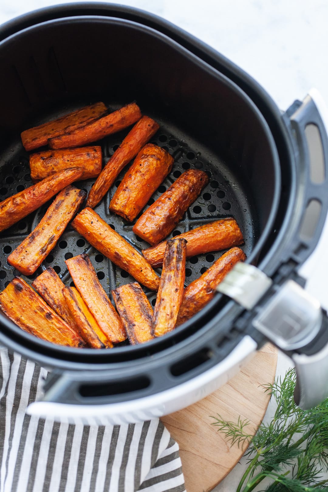 This quick, simple, and easy recipe for healthy air fry carrots is perfect for a delicious side dish. The carrots are “roasted” in the air fryer, and so flavourful with a crispy outside and tender inside. A touch of fresh dill is the cherry on top!