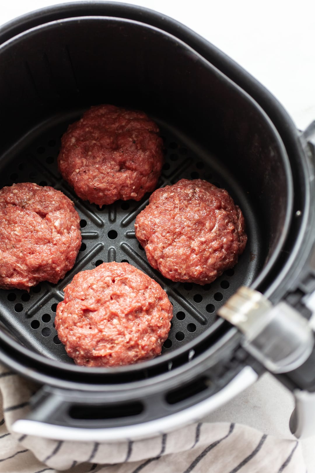 *If you prefer larger/wider thinner burger patties, divide the beef by 3, and make three burger patties instead of four then form into 1" thick patties, and indent the center of the patty with your finger to prevent the burger patty from puffing up too much in the air fryer.