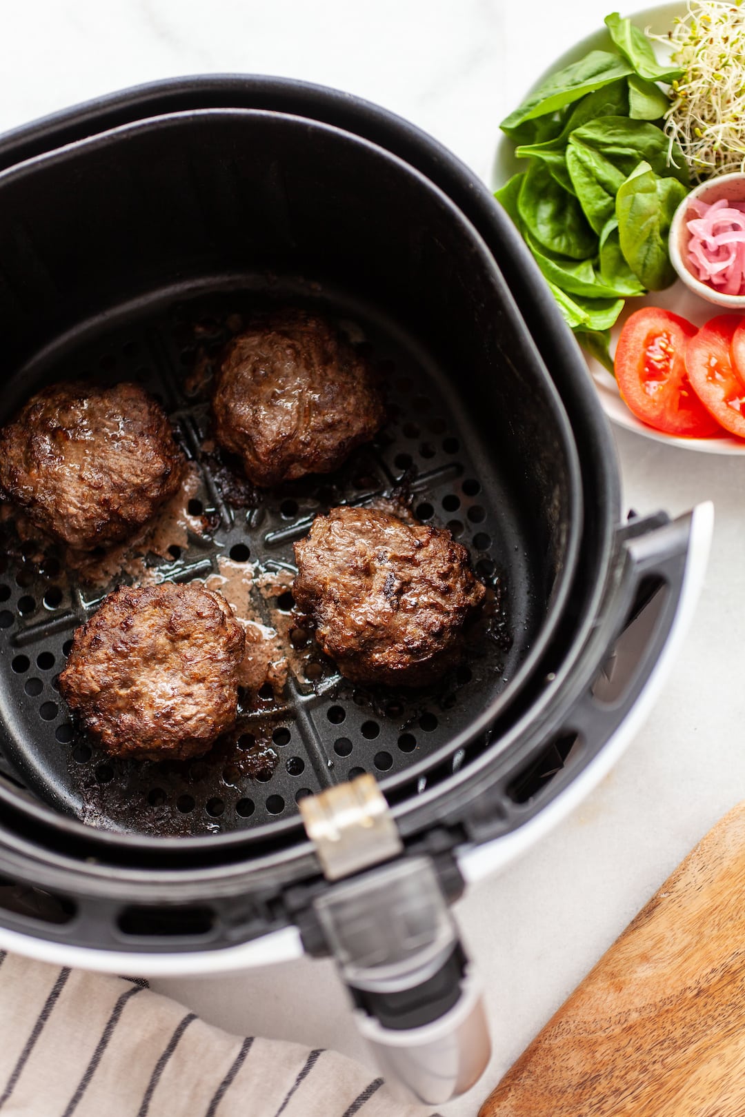 To make cheeseburgers, just add your favorite cheese (cheddar or dairy-free options work great) after cooking the patties. Close the air fryer basket for about a minute with the fryer off to melt the cheese slightly. Then, add your favorite toppings and enjoy some of the juiciest burgers ever!