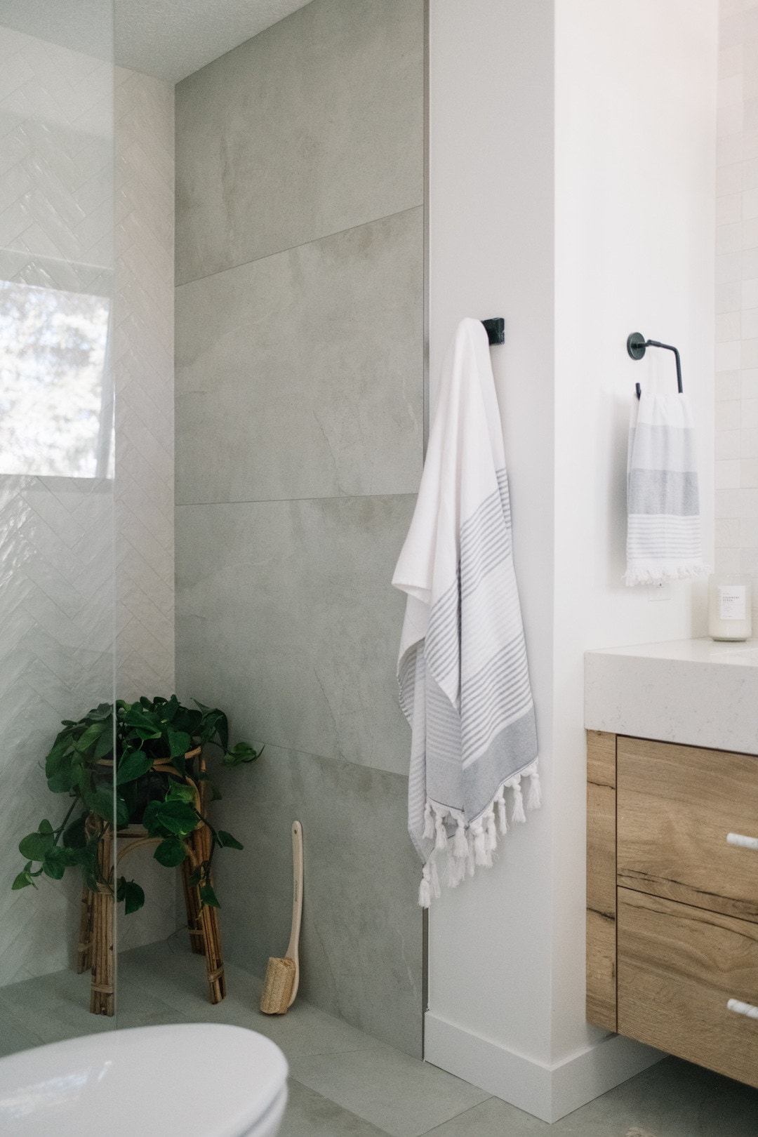 In the main bathroom we changed the layout as it originally didn’t make much sense and moved the tub/shower to the window. I love how much natural light this airy bathroom gets and it brings the consistency throughout with the Kitch Natural Halifax Oak and Hanstone Whistler quartz for the vanity. We chose a beautiful artisan tile introduced to us by the designers for the shower surround as well as a warm grey toned floor tile, and every day I fall more in love with this space. The bathroom truly has a calming retreat feel and makes for a perfect soaking spot once my toddler has gone to bed!