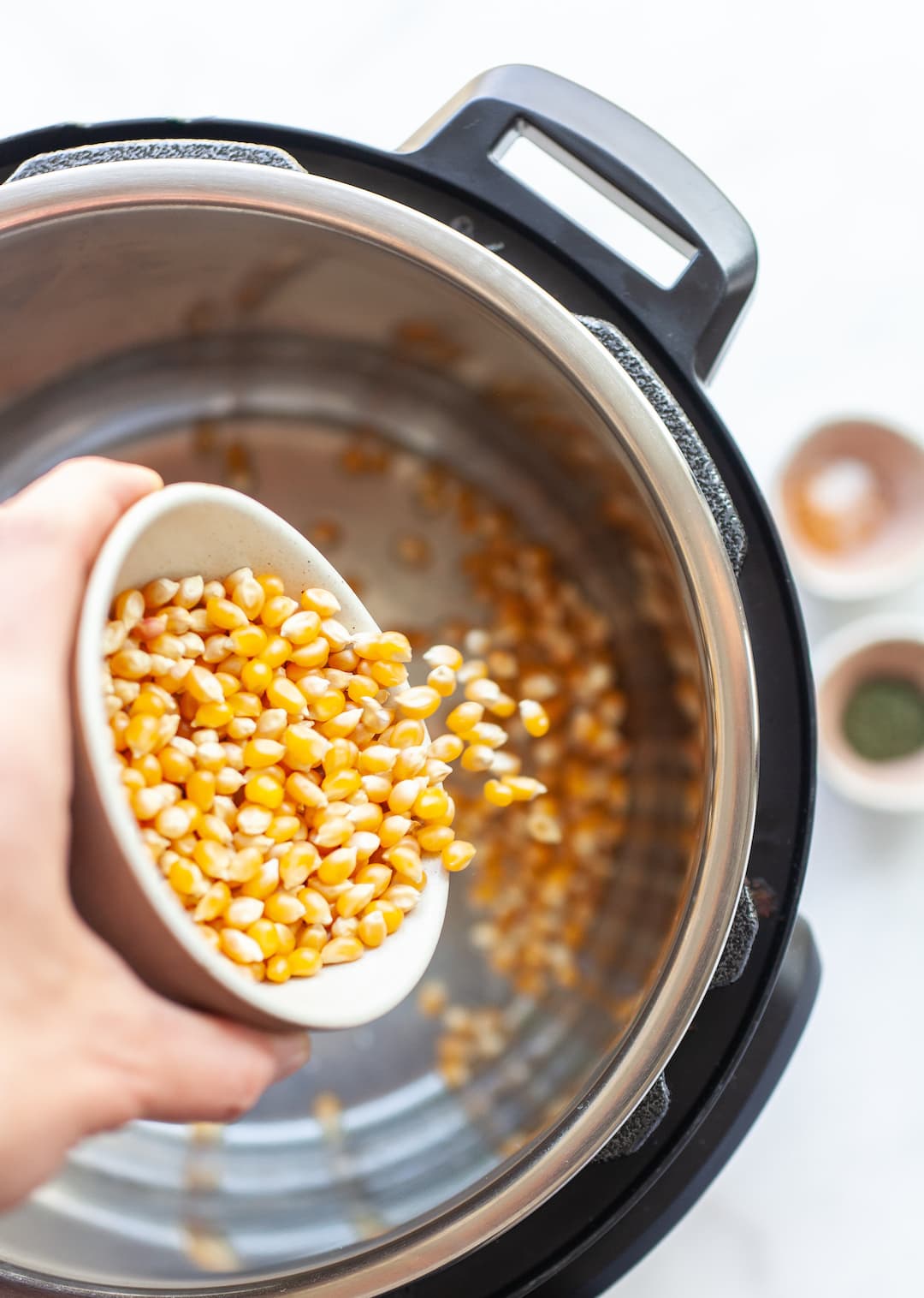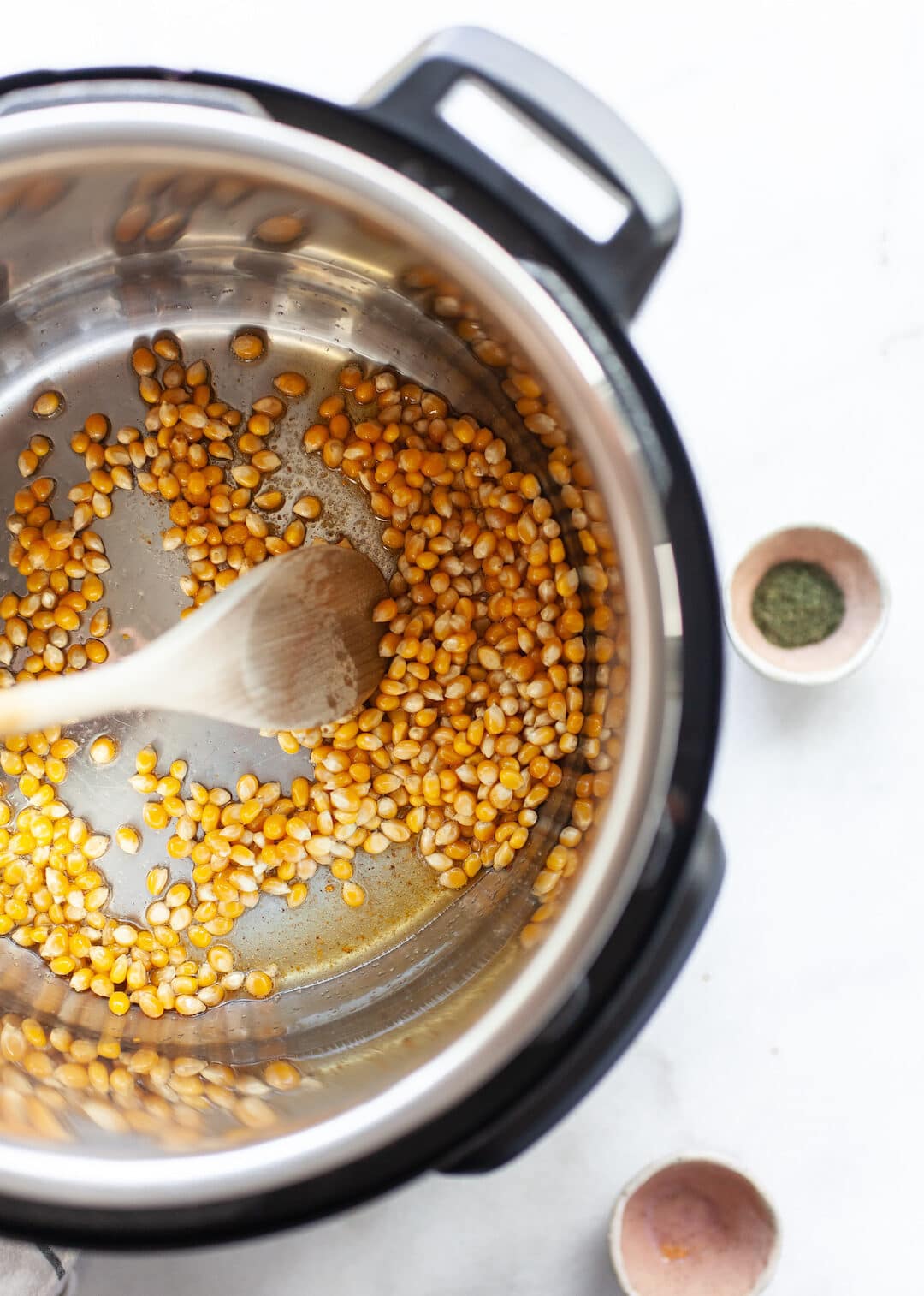 - ADD POPCORN KERNELS to the instant pot along with the salt and seasoning salt (if using), then STIR