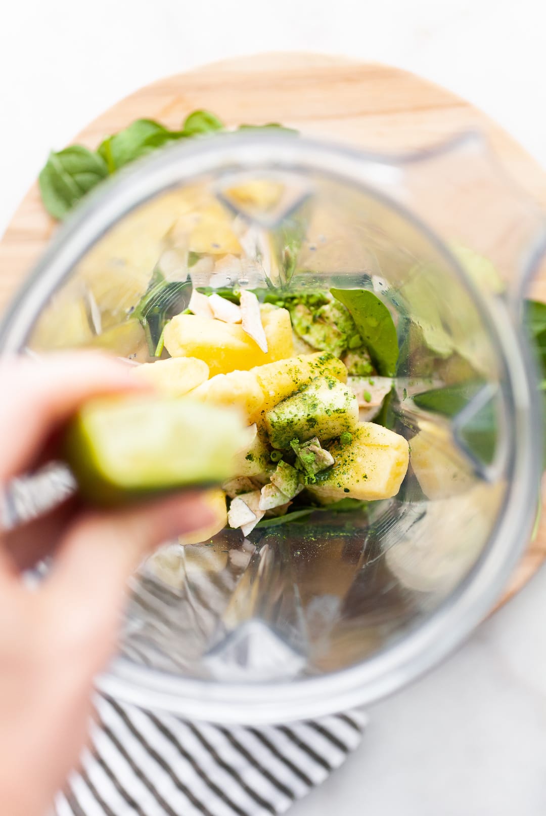 1. Add the spinach to the bottom of the blender, then add in the frozen pineapple and banana.