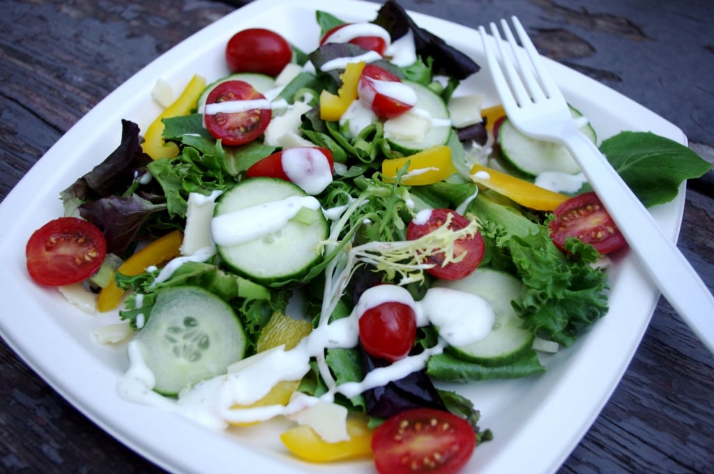 The garden salad was whipped up in a jiffy! I used mixed greens lettuce, sliced cucumber, halved cherry tomatoes, sliced yellow bell pepper, 1 slice of partly skimmed mozzarella torn into pieces, and 1 tbsp of Bolthouse Ranch Dressing. Although I usually prefer to make homemade dressing, this one works in a pinch and I really like the Bolthouse brand!
