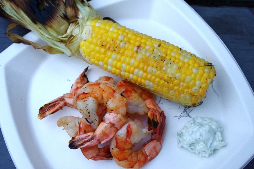 The prawns were seasoned with salt and pepper, and were very quick to grill! I really like prawns as they are low in fat and calories yet still pack a good amount of protein! The corn was put on the grill, husk on, and rotated a few times. When the corn is done you can just pull the husk back and enjoy! I didn’t even put butter on the corn as to me it has so much flavor already, I didn’t need feel the need for butter! On the side I added a dollop of Summer Fresh Cucumber and Garlic Greek Yogurt Dip to dip the prawns in! Delicious 🙂