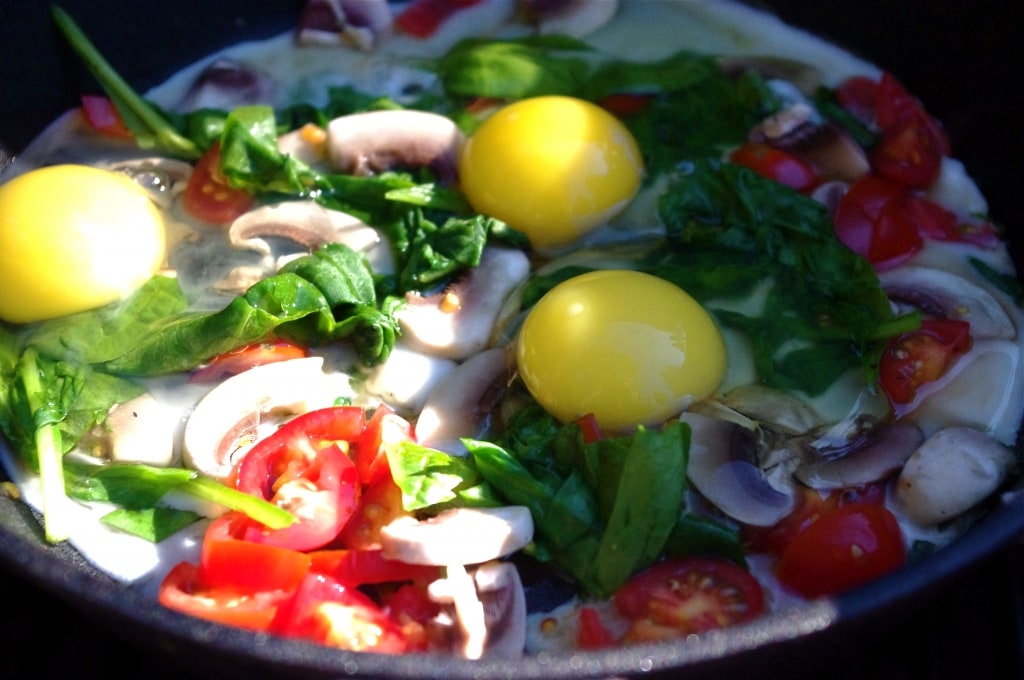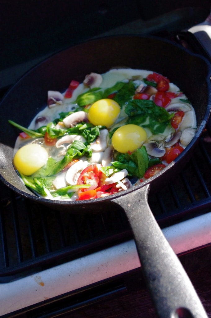 The next day we decided to do a nice hike up to this secret waterfall that Justin had gone to when he was in Radium as a kid, so we needed some real energy to get us going! We made Skillet Eggs & Spinach! This recipe is so easy and wonderful to make while camping. All you need is a heavy cast iron skillet and a fire or a mini BBQ. Eggs are a great source of energy, and adding a bunch of veggies makes this breakfast very nutritious!