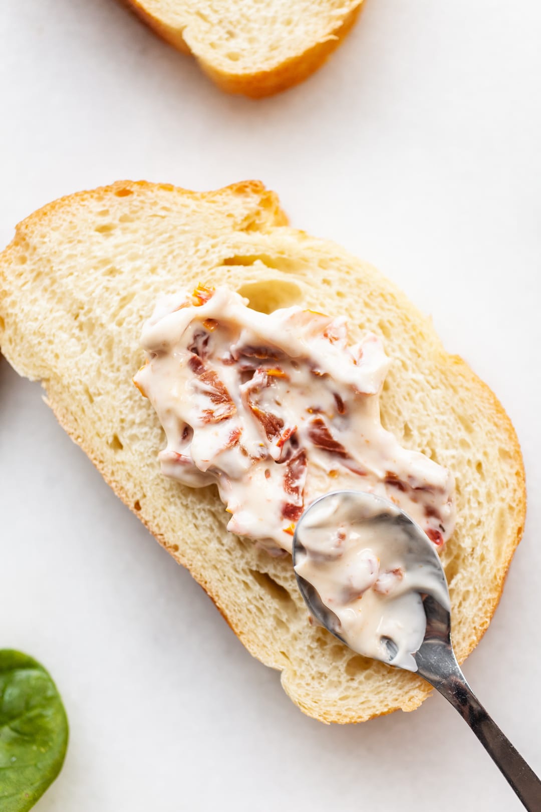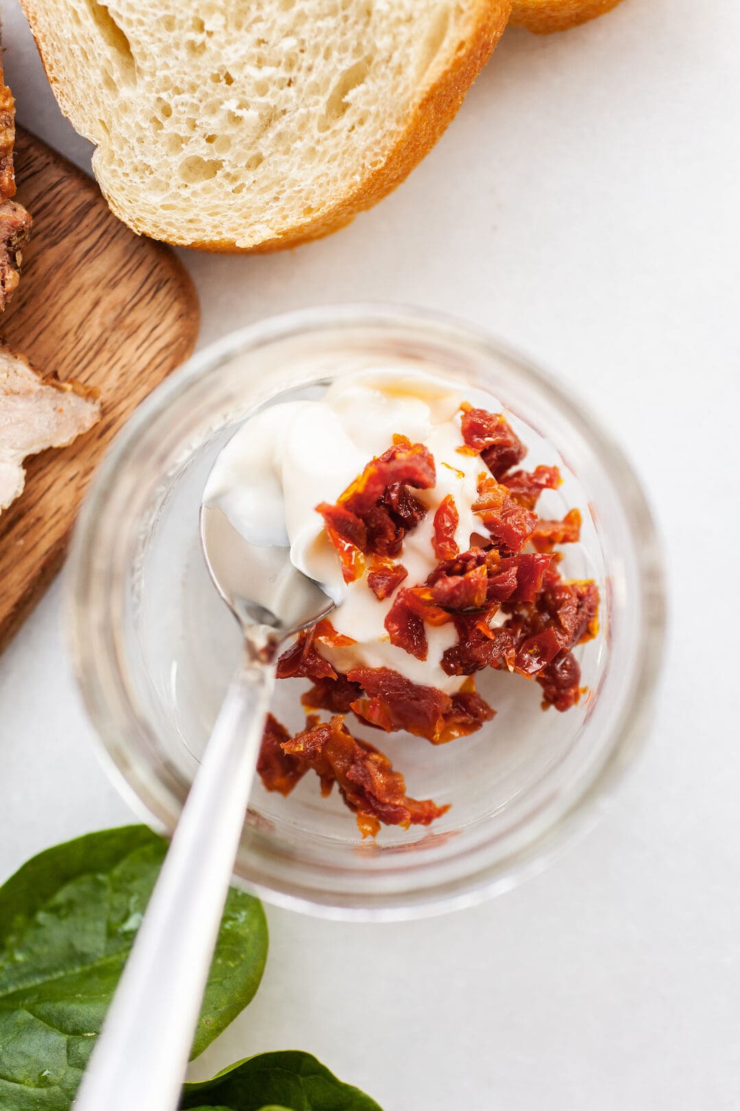- Make the sun-dried tomato mayo by combining the sun-dried tomatoes and mayo to a small bowl. Mix together, mashing the tomatoes to combine well with the mayo.
