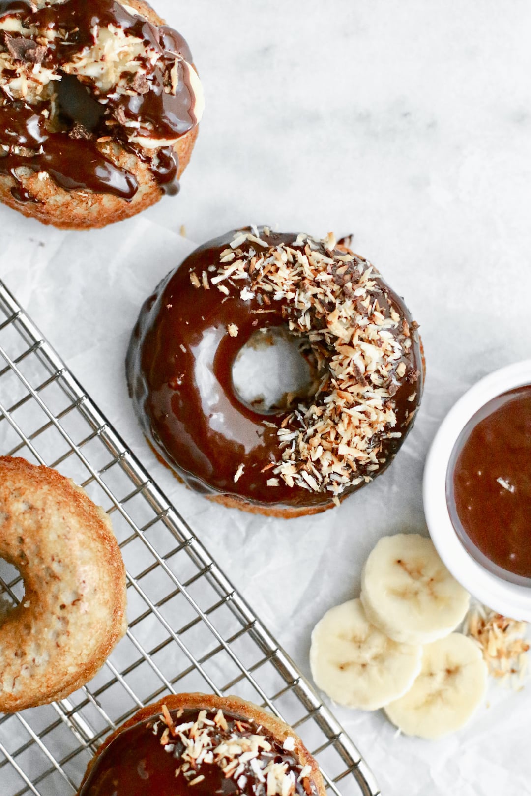 It’s amazing how with just these few ingredients you can get a rich, thick, shiny chocolate glaze that firms up and smothers the homemade banana bread donuts perfectly.