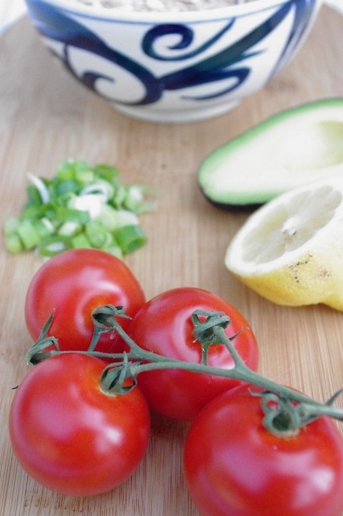 The tuna salad that fills the tomatoes is made with fresh ingredients like corn, avocado and green onion. It is moist and flavorful but still light with the use of lemon juice, dijon mustard, and a tad of low fat mayonnaise for the dressing. The cottage cheese I used was the dry curd variety and adds even more protein and a great tangy flavor. If you aren’t a cottage cheese fan this ingredient can easily be omitted!