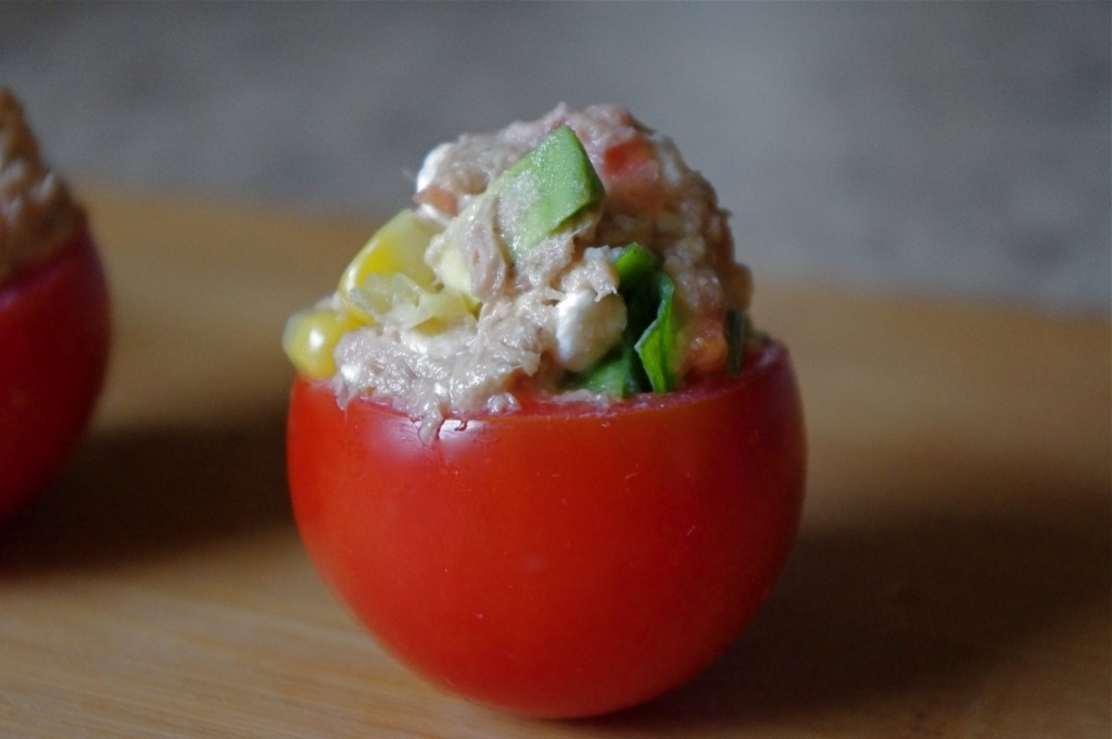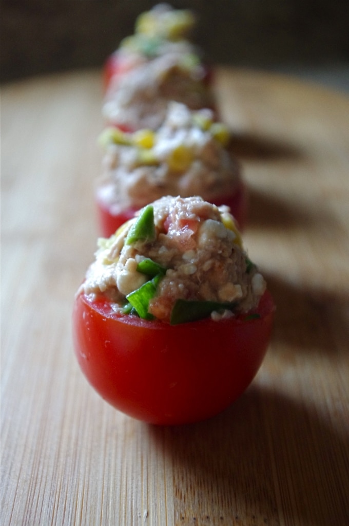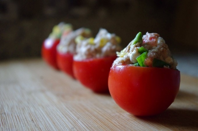I used sweet cocktail tomatoes for this recipe because they are the perfect size, not too small to stuff like grape tomatoes, and not too big either, just perfect! This recipe is great for those watching their carb intake, and still looking for something to fill them up!