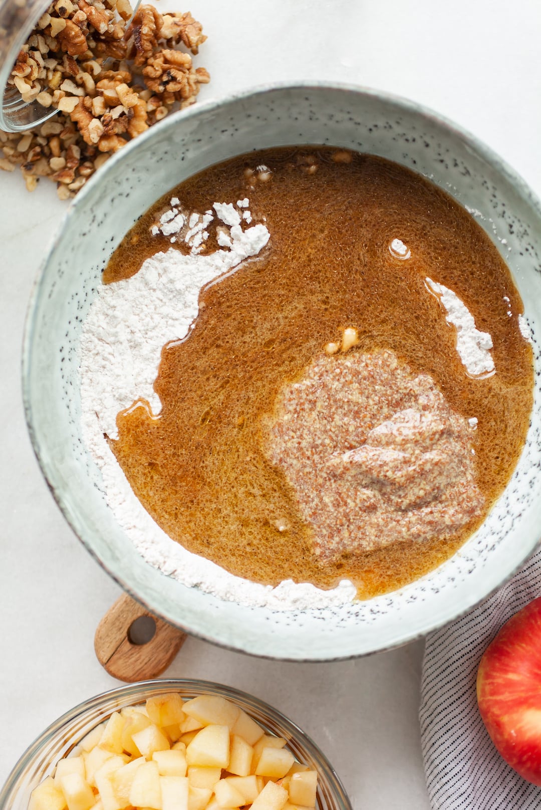 3. Make the "flax egg" by stirring the ground flaxseed and water in a bowl and set aside to thicken.