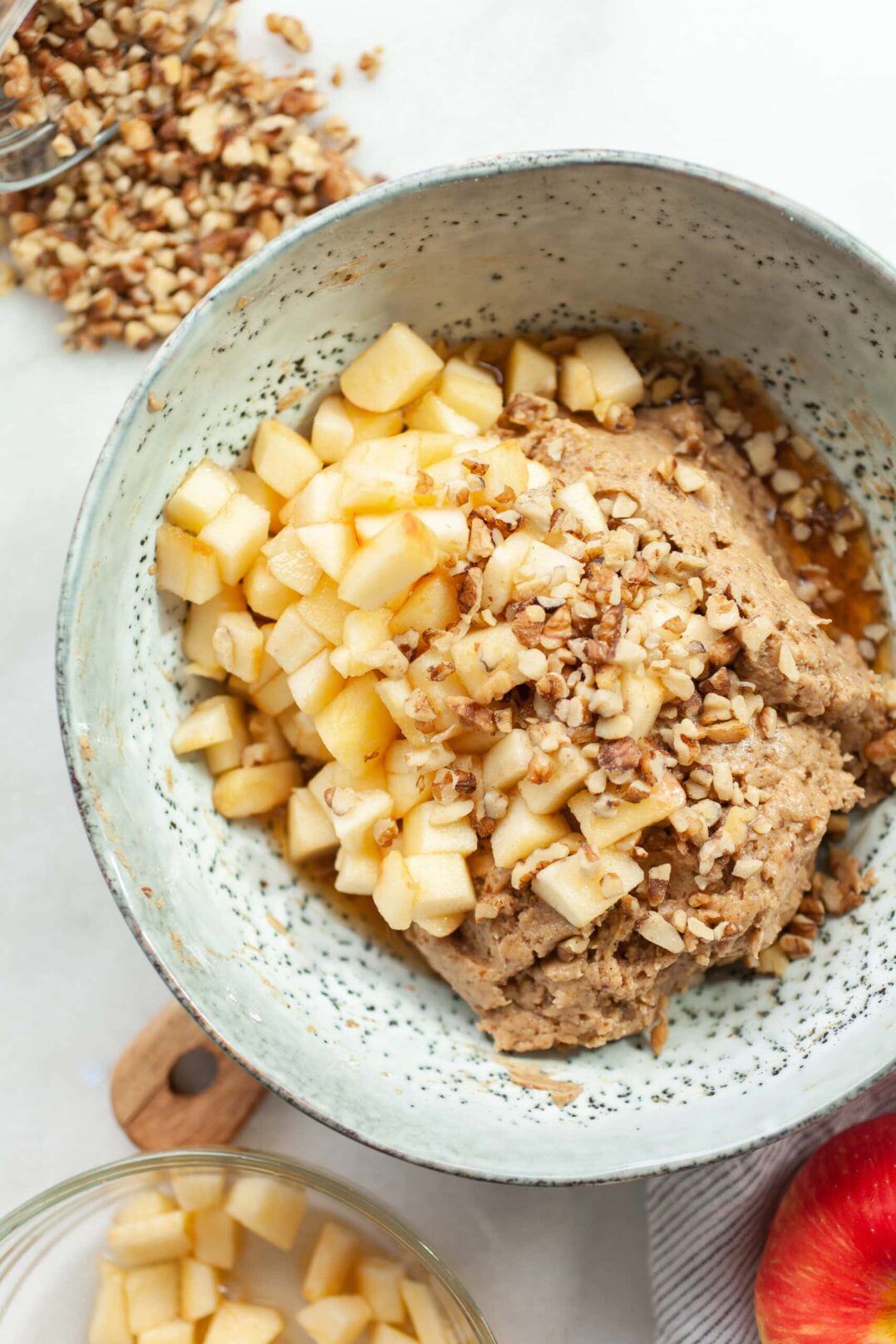 6. Fold the chopped apples and the chopped walnuts (if using) into the cake batter then spread evenly in the prepared pan.