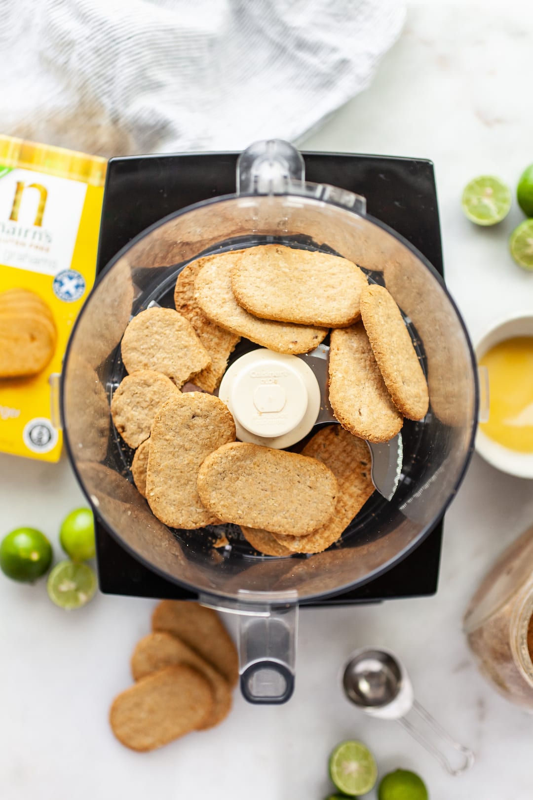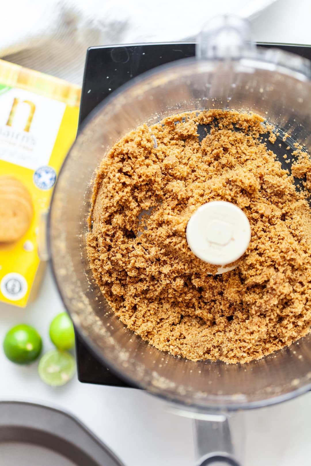2. Process the grahams, sugar, and melted vegan butter in a food processor until you get a crumbly mixture.