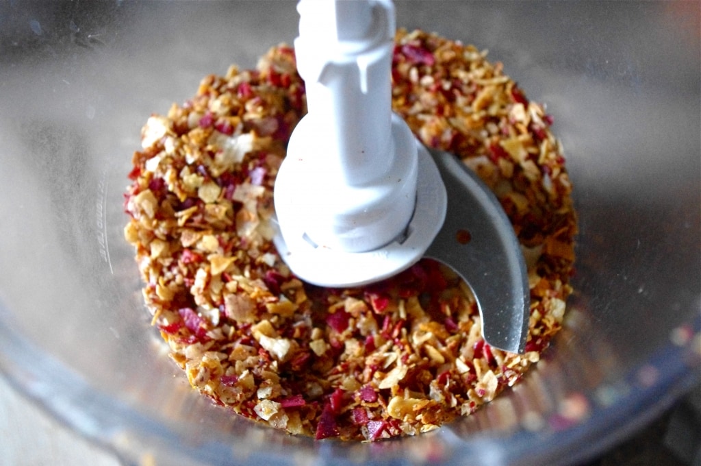- Place chips into a food processor and blend until just crumbly. Place into a bowl and set aside.