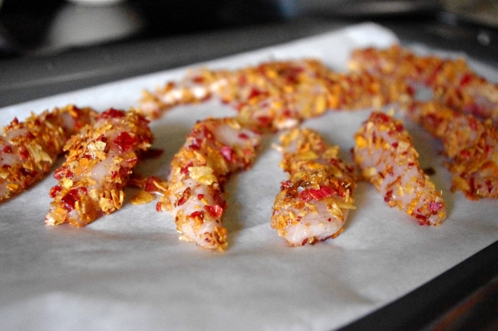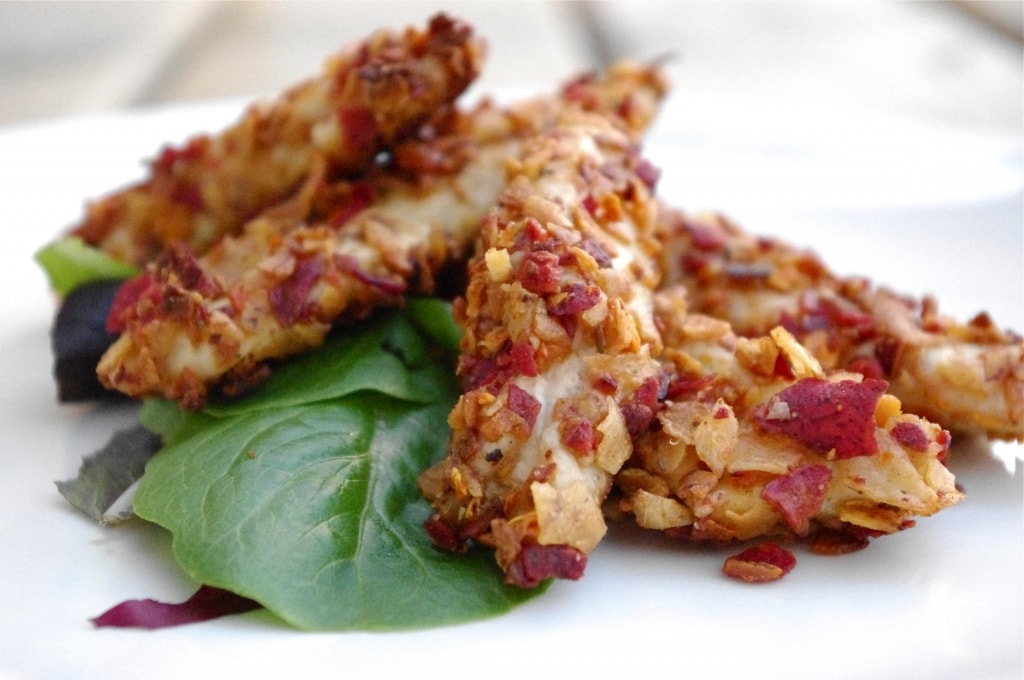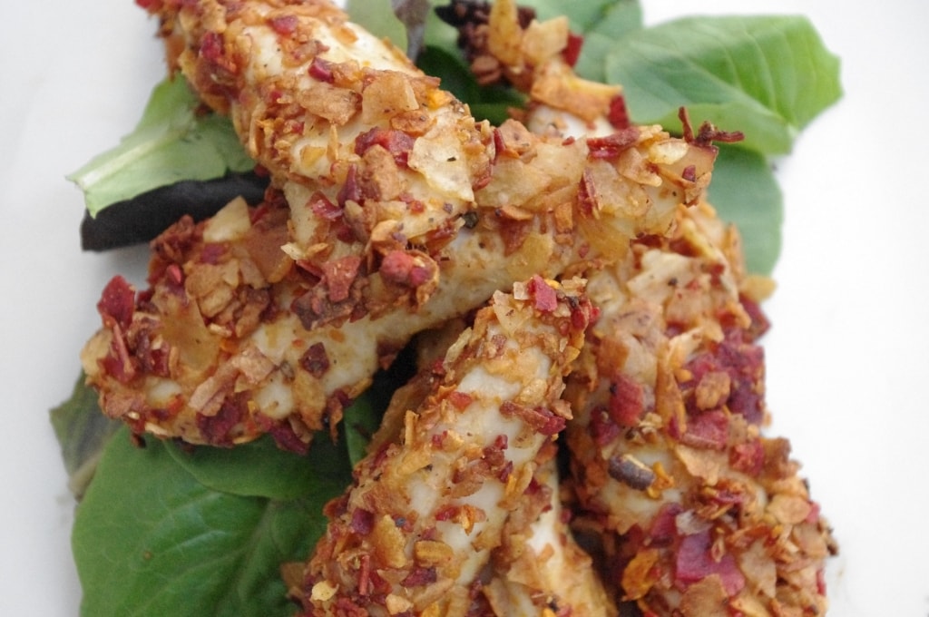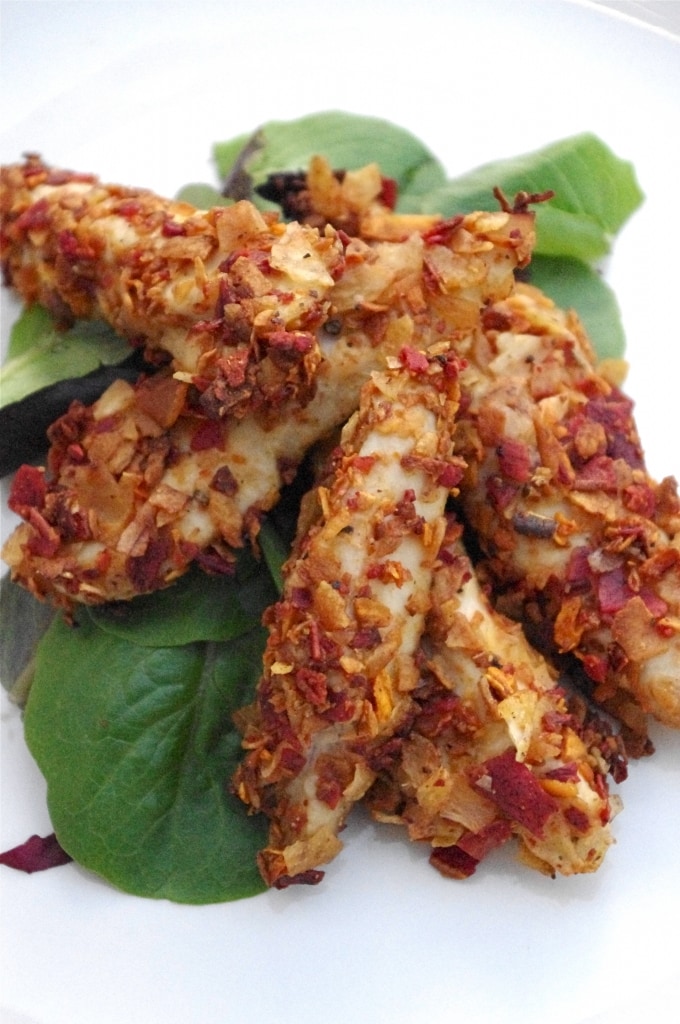 I went out and bought some TERRA chips (found usually in the organic section of the grocery store), or bought online here, and put these wonderful, crunchy, little chicken strips together.